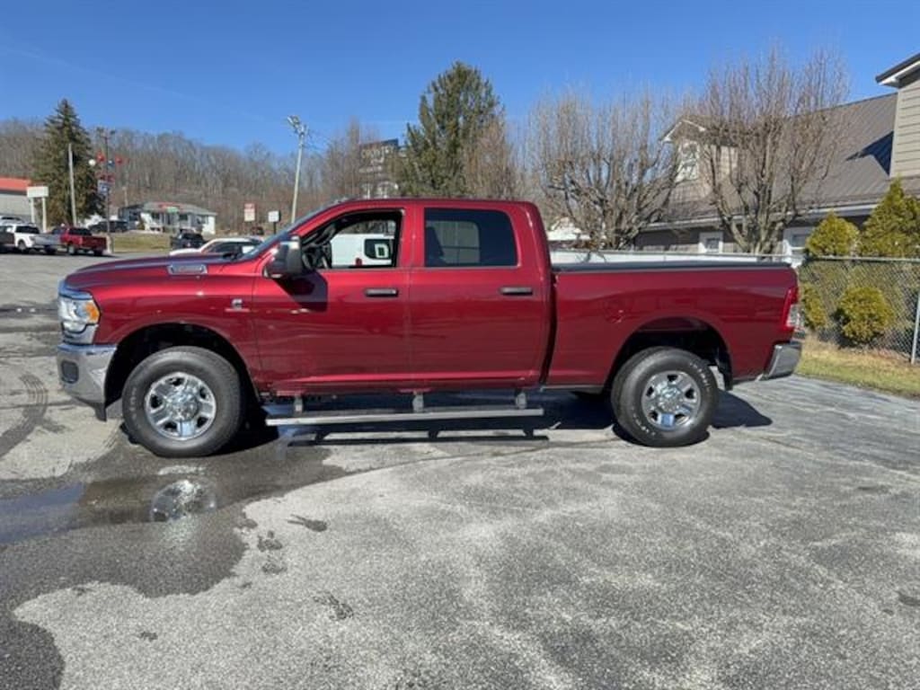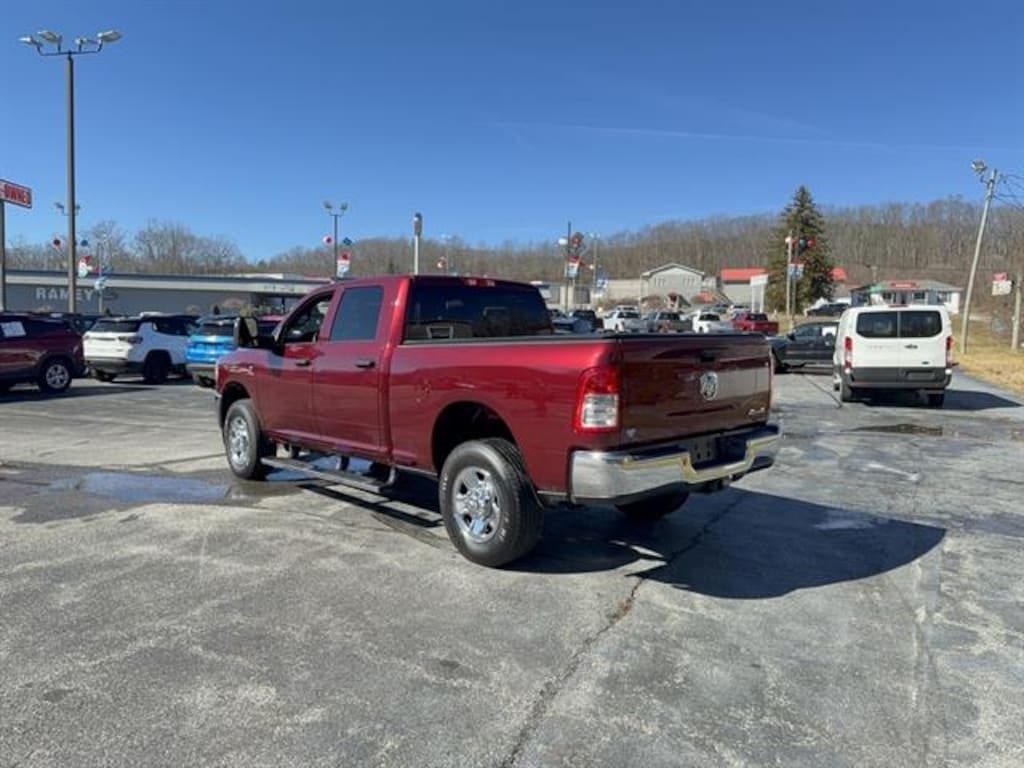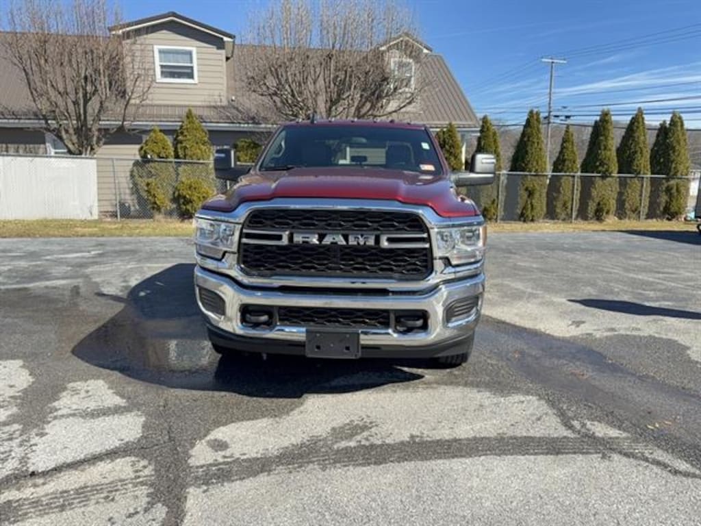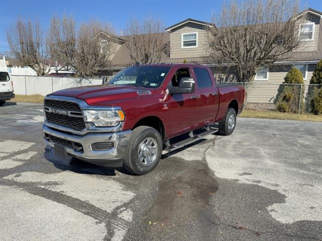 Drive away in power and style with this Red 2024 Ram 3500 Tradesman 4x4 Crew Cab! Equipped with the renowned Cummins 6.7L Turbo Diesel I6 engine delivering 370hp and 850 ft. lbs. of torque, this truck is ready for heavy towing and tough jobs. You'll appreciate the Class V trailer hitch, towing mirrors, trailer brake controller, and both 7-pin and 4-pin trailer wiring for all your hauling needs. Stay comfortable with a spacious Crew Cab, HD vinyl 40/20/40 split bench seat, and front/rear rubber floor mats. The Uconnect infotainment system with touchscreen, Bluetooth, voice controls, and electronic messaging assistance keeps you connected on the go. Added features like a spray-in bedliner, rearview camera, active grille shutters, and Tradesman Level 1 Equipment Group make this truck practical and durable. Safety features include front/rear side curtain airbags, stability and traction control, and trailer stability control. With a robust GVWR of 11,800 lbs., electronic shift-on-the-fly 4WD, and maintenance-free battery, this Ram 3500 is built to work as hard as you do.